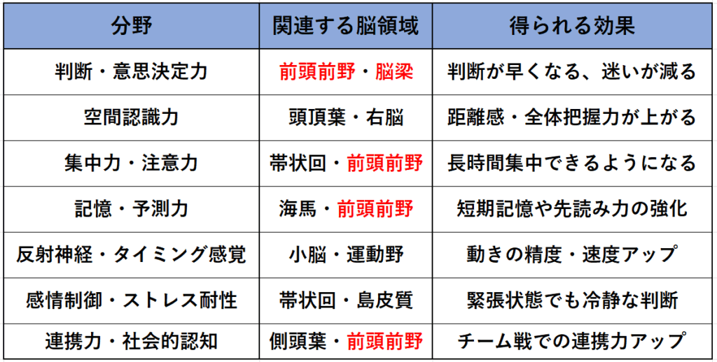 脳はただ無意識に使っているだけではなく、「今ここを使っている」「ここを伸ばしたい」と意識しながら使うことで、神経のつながり(可塑性)がより強く高まるとされています。例えば、ギミックを避けるときに「いま右脳で空間を読んでいる」と意識したり、仲間の動きと合わせるときに「前頭前野を使っている」と意識するだけでも脳の神経回路はより強固に形成されます。