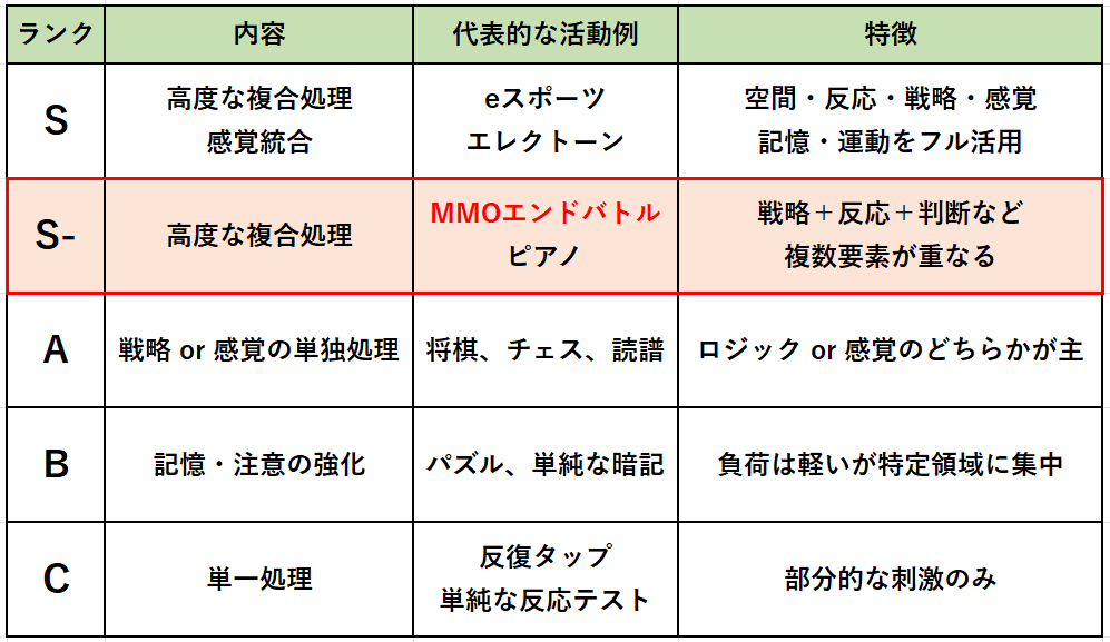 上の表は単一処理〜複合処理を階層化したもので、脳が複数の感覚・処理を統合するときの負荷を分析する考え方になります。エンドバトルはS-ランクに該当します。ピアノと同等の負荷レベルってワケっすね!