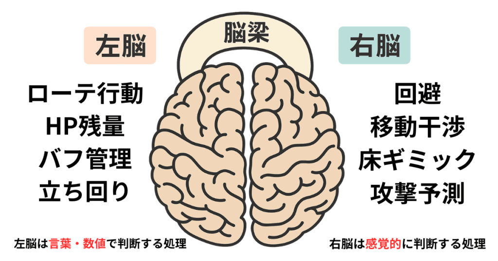 脳梁は、右脳(空間・直感)と左脳(論理・戦略)の情報を同期する部分で、脳処理のスピードを上げる思考と反応のタイムラグを減らす機能っす。この右脳と左脳の連携が早いほどプレイスキルが上がりますぞ!