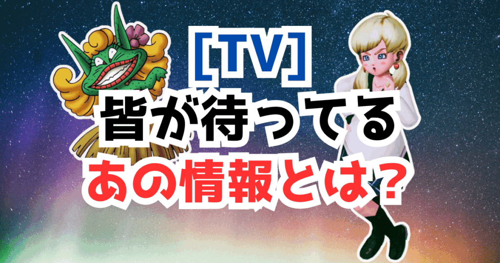 はいー!どーもどーもっス!何やら10/19日公開の予定のDQTVではみんなが待ってる『あの情報』の発表があるみたいっす!あの情報がなんの情報かは見てからのお楽しみです。スレ内でもその話題にでもちきりで盛り上がっていたので紹介していきます!それでは早速いってみましょう!