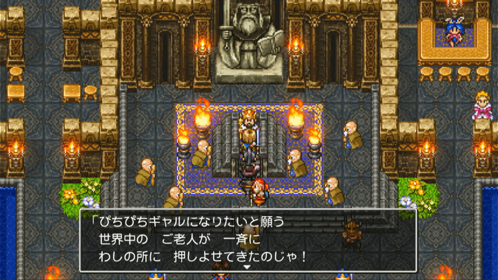 というわけでこれまでのギャル爺の経緯を振り返ってみましょう!初登場はDQ3のダーマ神殿です。以降、ダーマ神殿が登場する作品には皆勤賞で登場(DQ10除く)しています。そしてシリーズを重ねるごとに、老人の願望が着実と現実味を帯びてきたのです。