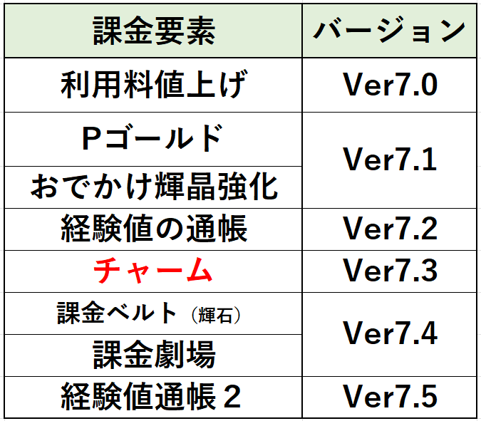 Ver7もっとも貢献した課金要素はぶっちぎりでチャーム課金といえるでしょう!ゲームアイさんが集計してるセルラン売り上げでもチャーム販売月の2月だけ数字が突出しているのがお分かりいただけると思います。2月って1年の中で日数が少ないんでふつうは他の月よりも売り上げが減るもんなんですけどね…。これはあくまでもツールでジェムを購入した人が対象なので、広場からジェムを購入した人の方が多いと思うんで実はもっと大きな数字になっていることでしょう…。