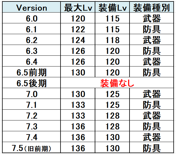 備は一定の法則があります。Ver端数0.2.4➜武器。Ver端数1..3.5➜防具となっており、6.5後期には装備の更新はありません。長年この規則性に沿って更新されています。