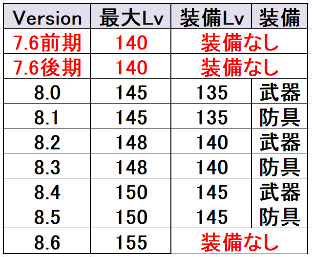 8.0 Lv140上限、Lv138装備