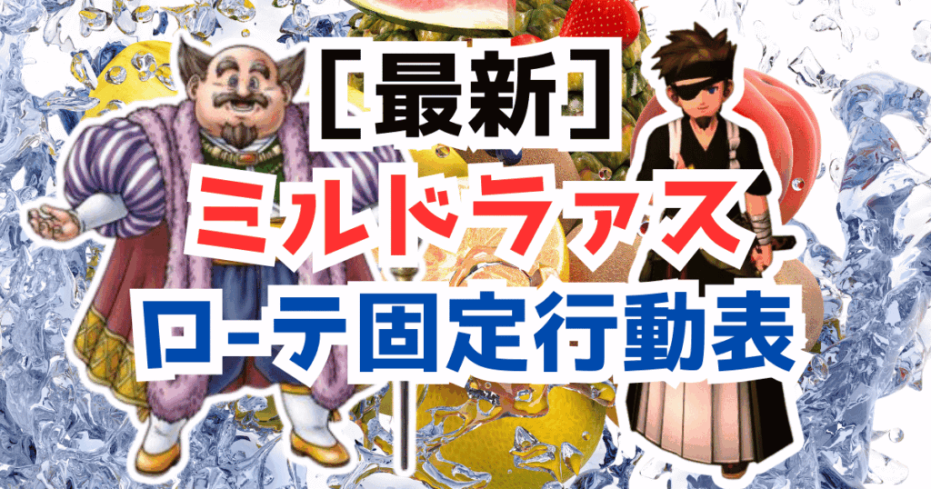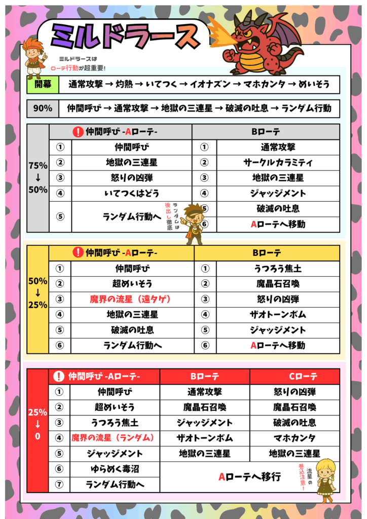 はいー!どうもどうもっス!ミルドラース行動表を一新しましたよー!このミルドラースというボスはとにかくローテ固定行動が多いので、行動表があるとめちゃくちゃ有利に立ち回ることが出来ます。ちなみに暗記する必要がありませんよ!画面の横に置いて照らし合わせながらで大丈夫っス!