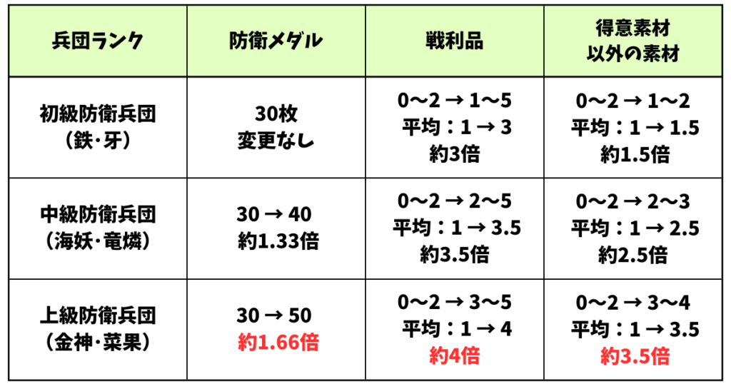…。この報酬上方修正はかなりエグイっすね…。注目すべきは比較的難易度が優しい最新兵団の「金神」でしょう!高速防衛なら90秒~120秒で周回できるので、1時間でメダル0枚➜1000枚も充分可能な数値です。報酬の交換で一番枯渇するのは防衛メダルですからね!今まで固定で高速周回していた人にとっては、アプデ後は効率は1.6倍増しになるワケっすね!