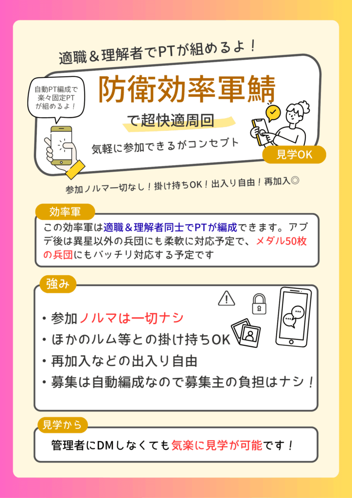 以前、効率よく異星周回ができる Discord の自動編成機能いわゆる「効率軍サーバー」を紹介しましたが、防衛ルームを考えている方にはこちらもぜひおススメしたいです。