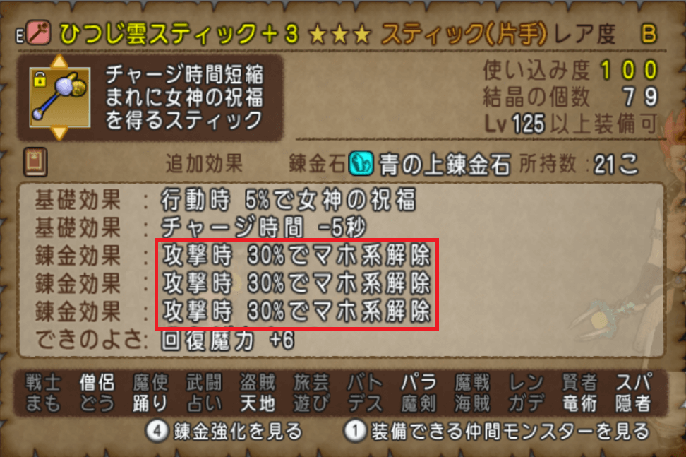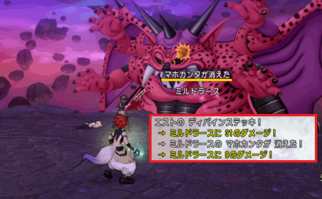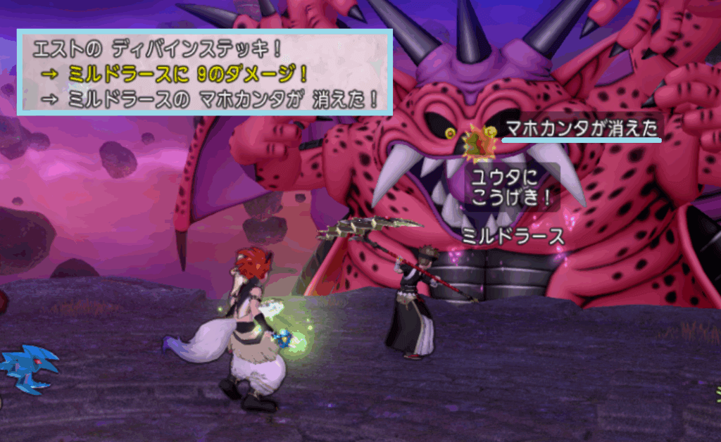 しかーし!攻撃時マホ解除の効果はしっかり入るのでミルドラースのマホカンタをディバインステッキで中距離(射程10m)から剥がすことができますよ!ただーし!呪文型の踊り子は攻撃力が低いのでミスになることもありました!