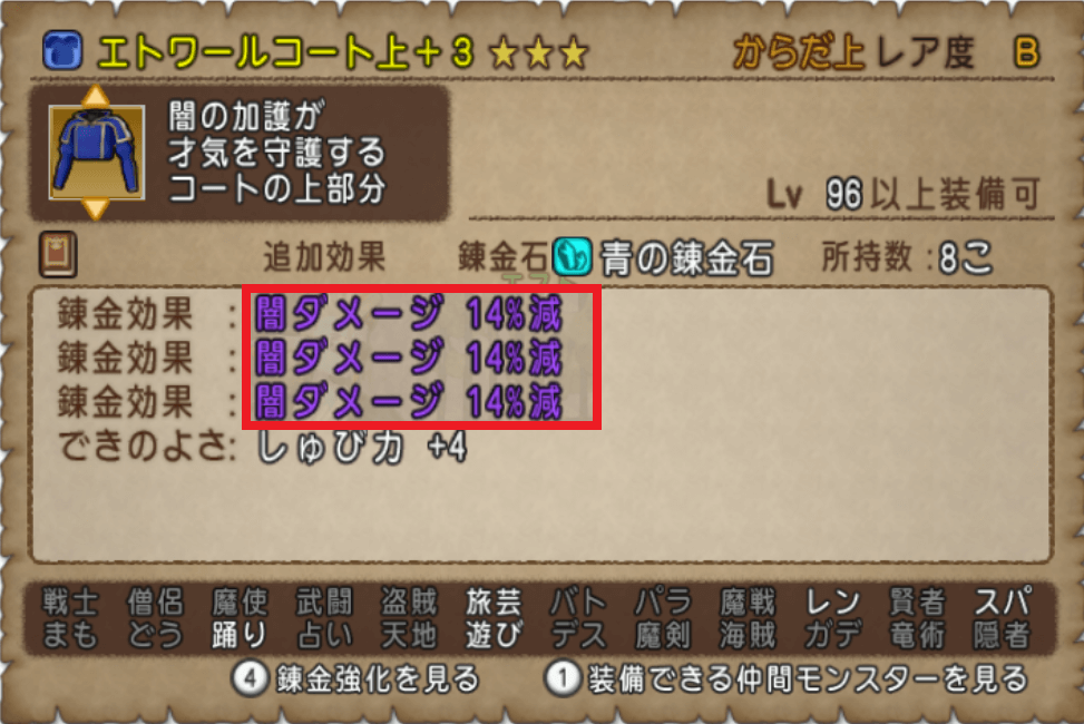 同盟ミルドラースにおいて魔界の流星で壊滅するんで闇100%装備が猛威を奮っています。踊り子は盾が装備できませんが、基礎効果に闇耐性20%ついてるエトワールセットを装備することが出来ます。しかし、闇100%にするとHPが下がってしまうので、防御行動をとらないと落ちてしまうことがあるので悩みどころではあります。