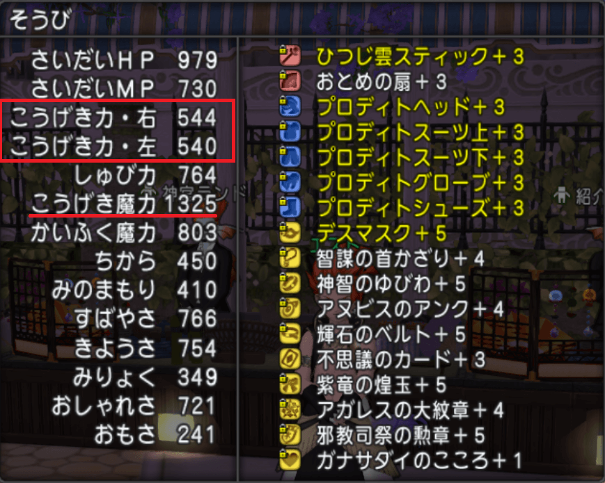 まず、呪文踊り子のスティック装備なんで攻撃力はかなり低いです。最新スティックと扇ならもっと数値は伸びるんですが、ひつじ雲の「行動時女神」とおとめの扇の「行動時聖女」で、守りが固いんでこの構成にしています。