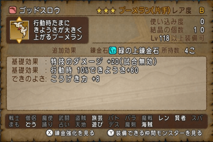 ゴッドスロウはLv118装備で『行動時10%できようさ+60』が大砲の火力を引き出してくれます。同様の効果がある斧武器「レラージェアックス」は「行動時5%できようさ+60」なので、発動率の違いからもゴッドスロウの優秀さが光ります。Ver7.6からはこの効果が2段階のるようになったことで注目を浴びています。