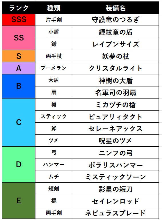 上!独断と偏見によるランキング評価でした!エンドで活躍する武器や人気の武器種は高めの評価になっており、現状人気のない武器種は相対的に低めの評価になっています。もしよかったら読者さんがGETしたい装備も教えてくれたら幸いです!