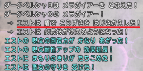 強戦士の書に登場してくるダークペルシャを相手に検証したところ、メラ系の呪文はしっかり盾ガードが発生しています!ドルマドンは一度も盾ガードが発生してないのでWikiの情報は正しいと言えます。メラ系と言えば連続メラガイアーを使ってくる敵は結構いるんで盾ガードが狙えますね!