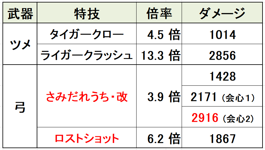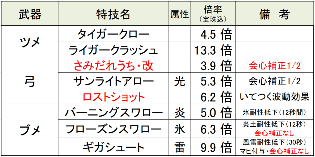 倍率だけでみるとブーメランが優秀な数字となっています。ブーメランスキルには炎・氷属性低下時にダメージ+50がついていることと、会心補正がないCT技が強力なので属性が通る敵には高ダメージが期待できます。最大倍率のライガークラッシュも目に止まりますが、ツメという武器種は攻撃力が低く設定されているという弱点があります。ちなみに強化された「さみだれうち改」はこの表では最下位の倍率となりました。