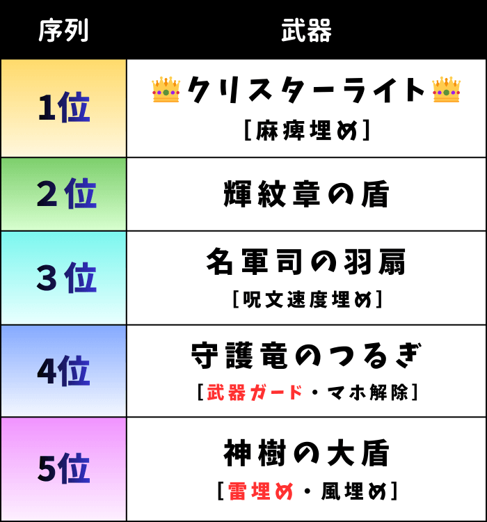 輝紋章の盾と併せて装備したいのが「武器ガード埋め」がついた片手剣です。武器ガードでも盾の「ガード時必殺」効果が発動することから、片手武器で唯一武器ガードが発生するこの効果は、いわば必殺率を上昇させる効果と言っても過言ではないでしょう!ガード率極限まで高めたパラディンでパラガ連発狙いが話題になりました。