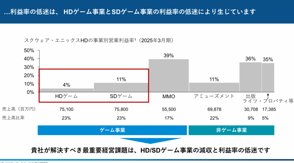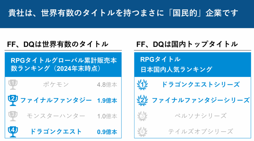 3Dファンドは110ページを超える資料を公開し、スクエニに対して「本当に新しい挑戦ができているのか?」と強い問題提起を訴えました。また「過去の成功に安住し、課題から目を背けていないか」と問いかけ、日本を代表するゲーム企業でありながら、この3年間で売上の伸びが止まり、利益率も低迷している現状を厳しく指摘しました。