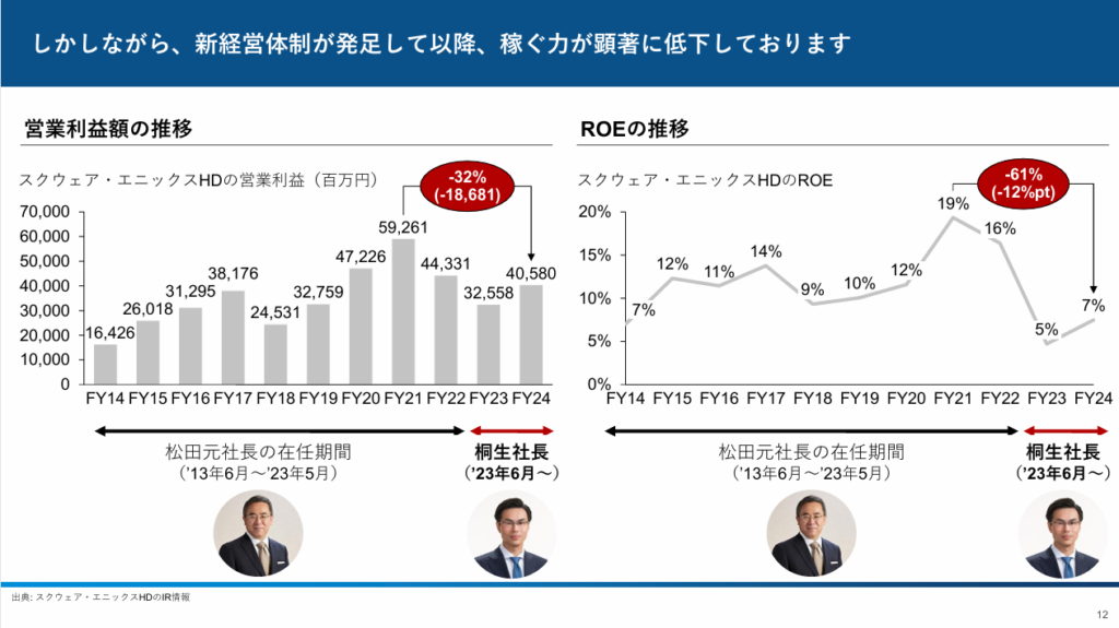 の資料では国民的企業だけど「売り上げは低下してるよね!」ってことが書いてあります。要約すると、営業利益はピーク時より-32%減(-188憶)になってることと、ROE(資本を使って利益を生み出す力[稼ぐ力と思ってOKっス])がピークの時よりも-12ポイント(-61%)になってるということを表しています。
