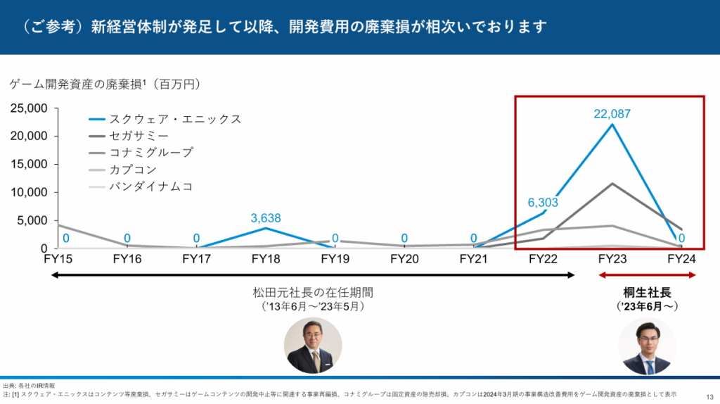 れはスクエニ220憶円損失!ってニュースにもなりましたね!作りかけや開発中だったゲームを途中でやめてその費用を損失として処理した額です。他社と比較してもスクエニが突出しています。余談っすけどFY22年~23年は他社も数値が高くなっていますが、これはコロナのときに「売れるかも」と大量に作り始めたゲームが、コロナが終わって売れなくなり「このまま続けてもムダだ」と判断され破棄されたためと言われてるっす。