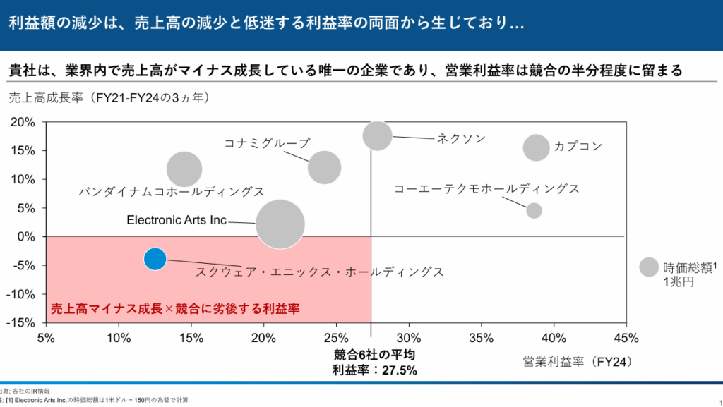 の図は、スクエニが業界内で唯一売上高がマイナス成長となり、営業利益率も競合平均の約半分にとどまっていることで、売上の減少と儲ける力の低下が同時に起きてて、他社より不利な立ち位置にあることを示してますね💦