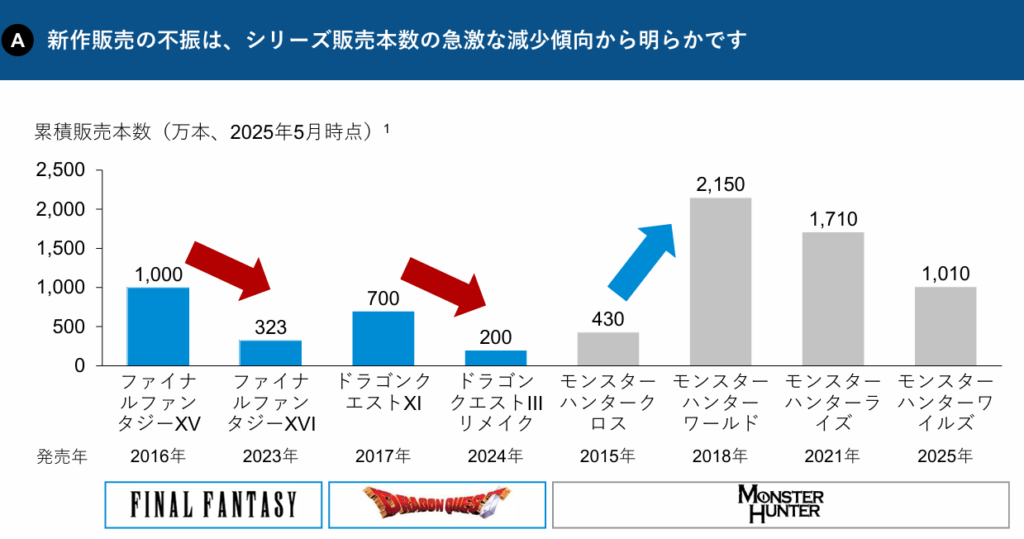 の図は、スクエニの主力シリーズであるFFやDQが新作を重ねるごとに販売本数を大きく落としている一方、競合のモンスターハンターは新作でも安定した売上を維持しており、シリーズ戦略の差が明確に表れていることを示してるっすね!2025年のモンハンはまだ途中経過の本数です。
