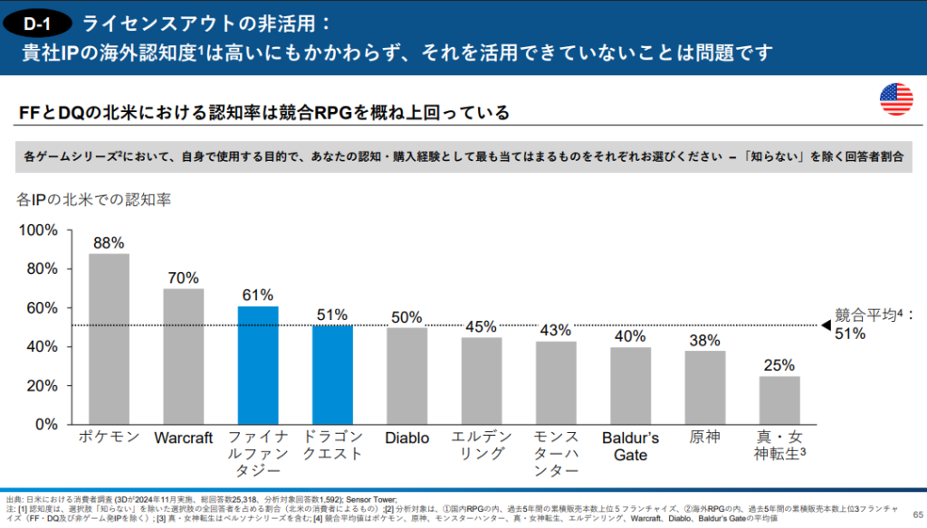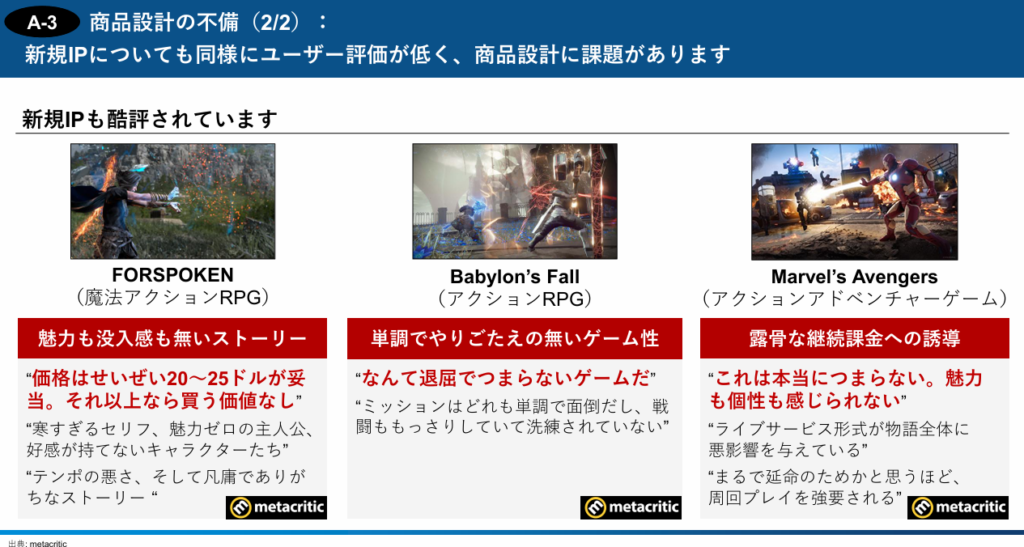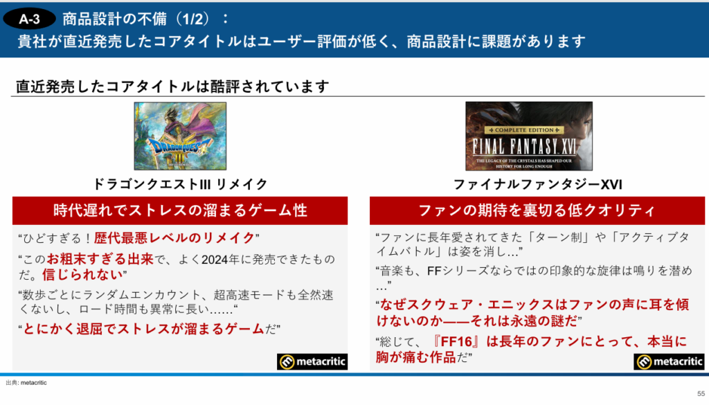 の資料についてはちょっと補足させてもらいます!一通り資料に目を通したんですが、一般的にドラクエ3は売り上げも良くて世間ではスクエニの売り上げに貢献した作品と言われています。つまり売れても評価が伴わない商品設計が続いているという構造的な問題があるから「戦略を見直せ」って3Dが言いたいんだと思います。