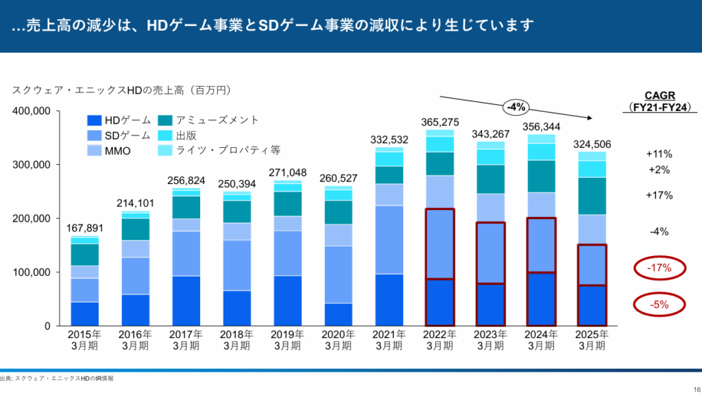 のグラフは事業別売上推移を積み上げ棒で示し、どの事業が伸びどの事業が落ちているかを可視化していますね。スクエニの売上減少がHDゲーム・SDゲーム事業の縮小によって生じている一方で、MMOは高成長を続けており事業見直しが不可欠であることを示してるっすね!