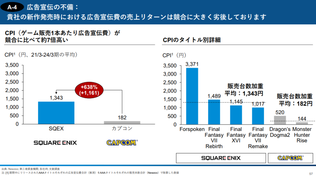 スクエニは広告を使っても売れる効率が低く、1本売るのにお金がかかりすぎている状態を示してることが読み取れるわ!
