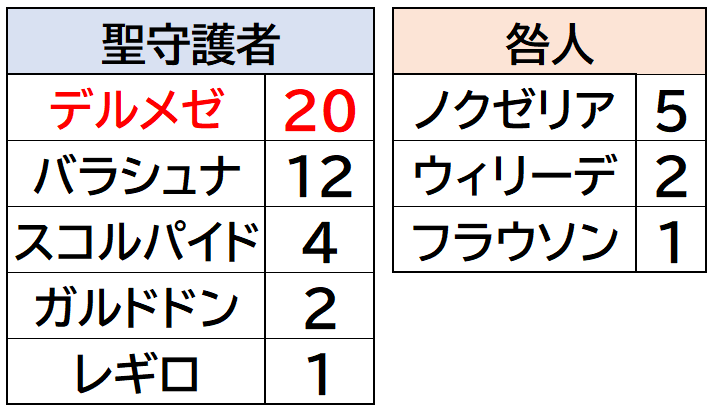 緑玉の募集をみればデルメゼの人気は一目瞭然っス。ほかの聖守護者や咎人と比べても募集人数が頭ひとつ抜けてて、実装から5年以上経った今でも多くのプレイヤーが繰り返し挑んでいることが数字ではっきり示されています。デルメゼが未だエンド最前線に君臨し続けている理由を如実に物語っているわな!