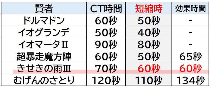 呪文職はCT技が多いため、CT短縮効果を引ければスキルの回転率が大きく向上します。CTの回転が良くなるということはそれだけ火力アップに直結します。また、開戦直後にCT短縮を引ければ他職よりも10秒早く霊脈魔法陣を展開できるため、地味ながら霊脈の回しやすさも向上します。(上の表は初回CTは無視・効果時間は宝珠lv6込で計算)