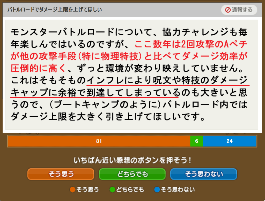 して、バトロ内のバトル環境も独自の仕様になっている点も改善して欲しい所ですよね…モンスター自体はかなり強力なのに、特技ごとの天井ダメージが低いせいで活かしきれないことが問題視されています。スレで紹介はしていませんが、Aペチ放置問題についても声が上がっていましたよ!