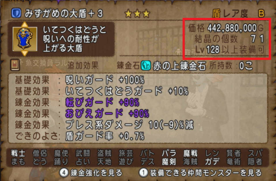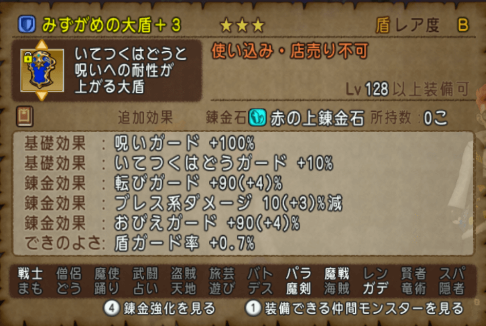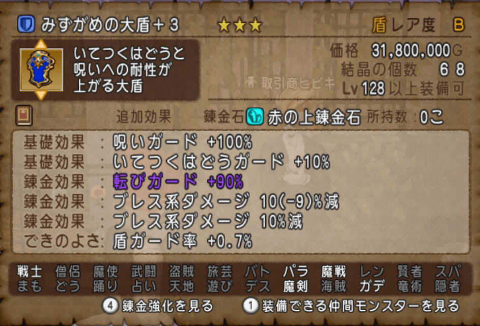 基礎効果にブレス13%減+行動時バーハがついてる古代鏡の大盾もデルメゼ戦では人気で好みが分かれそうですが、みずがめの大盾の「呪い100%」という錬金効果2つ分なので、入手は大変ですがGETしたら乗り換える価値はあるかなと思います!