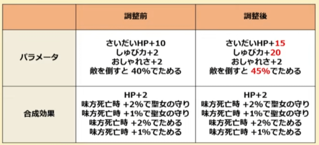 強化内容な基礎効果がHP+5・守備力+18・敵を倒すと+5%でためるが上昇効果となっています。さいだいHPが上がるのは嬉しい強化ですね!HP理論値だと合計+25加算されるんでHPを優先して盛る場合は選択肢に入りそうです。