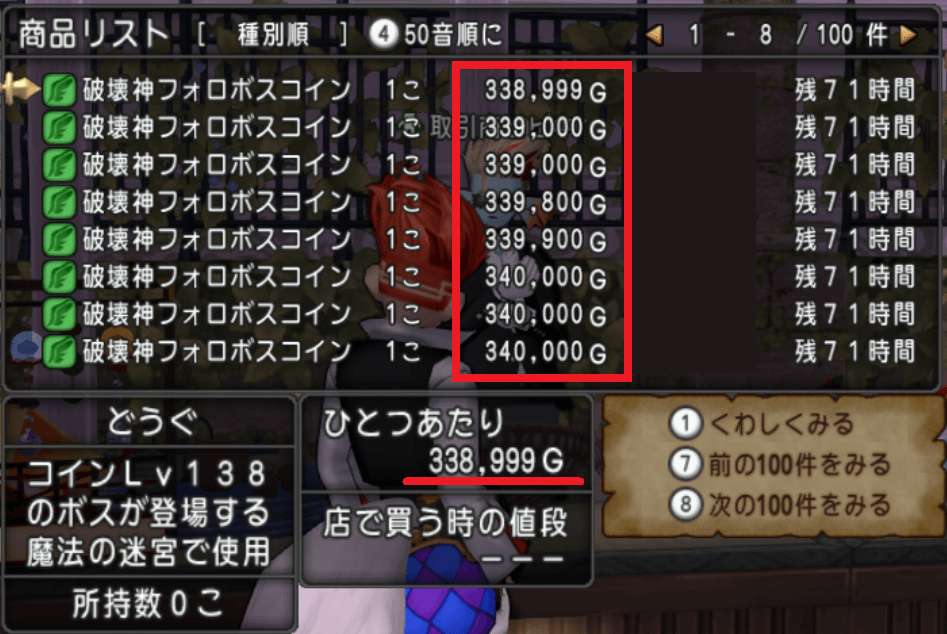 強化修正の煽りを受けてフォロボスコインが少し値上がりしました。以前は30万きっていたのでだいたい5万くらい吊り上がっていますね。ちなみにデスマシーンコインは変わらず19万代で推移していました。