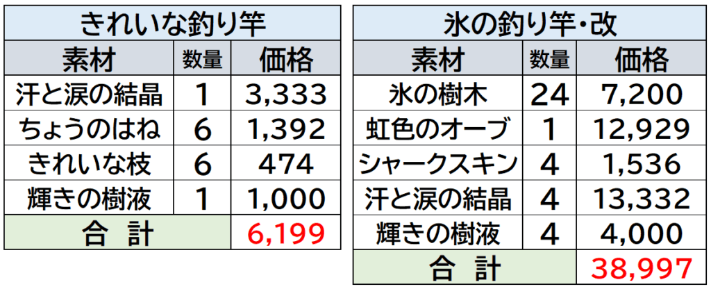 両者の売価はともに7万ゴールドですが、原価を比較するとその差は上の表の通り32,798ゴールドの差があります。職人目線でみると氷の釣り竿は回転率がいいため薄利多売で稼げますが、きれいな釣り竿は利益が大きいので効率よく稼げることと、職人レベルが低いうちからでも稼げる商材となっています。