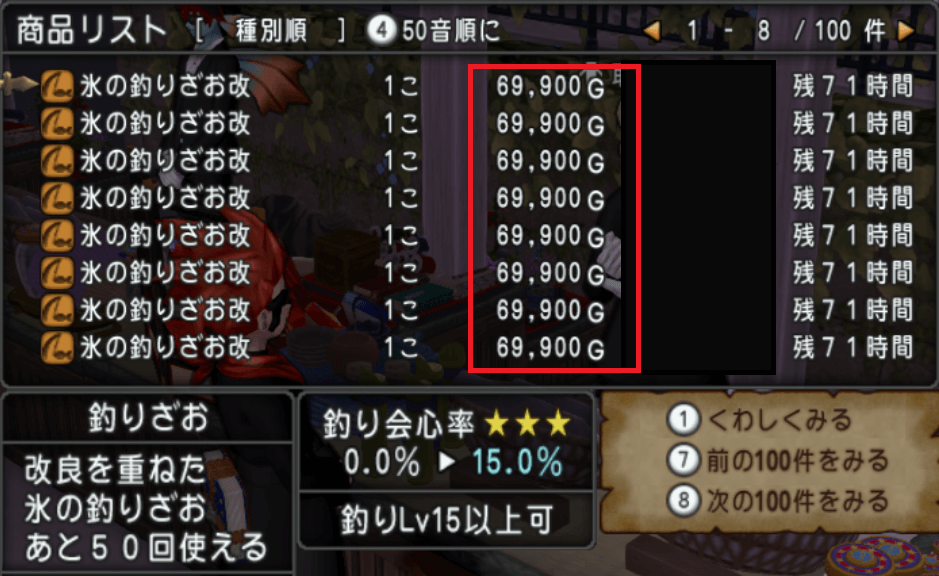 一方で、釣り竿の中でも一番人気で最強クラスの「氷の釣り竿・改★★★」も、きれいな釣り竿とほぼ同じく7万ゴールド前後で推移しています。こちらは出品数もかなり多いため、価格競争が起きやすく、最安値が更新されやすい状況なんですよね。