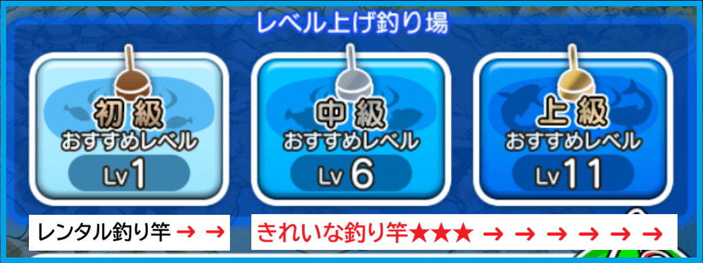 新規キャラは釣りLv1〜5までは無料のレンタル釣り竿で十分ですが、Lv6以降の中級釣り場ではレンタル竿が使えなくなります。そのため、このタイミングで「きれいな釣り竿」を購入する人が増えるわけです。特に★★★を選ぶと中級レベルの釣りがかなり快適になります。また、釣り老子の依頼報酬を活用すればLv15まではきれいな釣り竿で十分対応できます。Lv15以降は氷の釣り竿・改へ移行するのが定番ルートっすね!