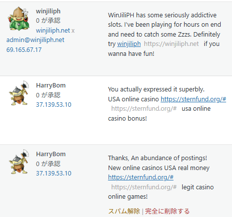 パムとはブログに届く迷惑メールみたいなものっス(上の画像がスパムコメント)。対策をしないと、コメント欄に大量の自動カキコミで埋めつくされるので「迷惑メールフィルター」というプラグインを入れるわけっス。こうすることで1日200件のスパム攻撃がわずか2~3件まで減らせることが出来ます。
