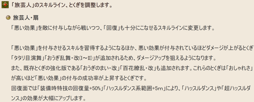 扇旅芸人はデバフ特化のスキルラインとして強化が入りました。見て分かるように、攻撃時にルカニ・ぶきみのひかり・魔導の書(デュアルブレイカー効果)のデバフ効果があるので、攻撃と同時に弱体化が狙えます。とくに魔導の書が入れば、扇技の百花繚乱や、必殺技のトリックゾーン・ゴッドジャグリング等のデバフが目に見えて入りやすくなります。また、ハッスルダンスの回復量はブーメラン装備より+50%ほど劣りますが、効果範囲が+5mプラスされるのは嬉しい効果となっています。