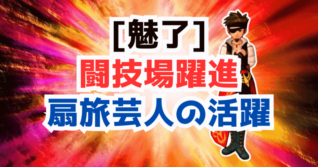 扇旅芸人は最強装備の「輝紋章の盾」・「名軍司の秘扇」の登場と、乱戦になりがちな戦闘で必殺が発動しやすく「アクロバットスター」で生存能力をあげ、トリックゾーンを含む豊富な範囲デバフ技が刺さるので、闘技場では十分に主役を張れるポテンシャルを持っている!