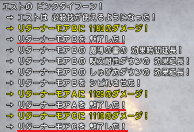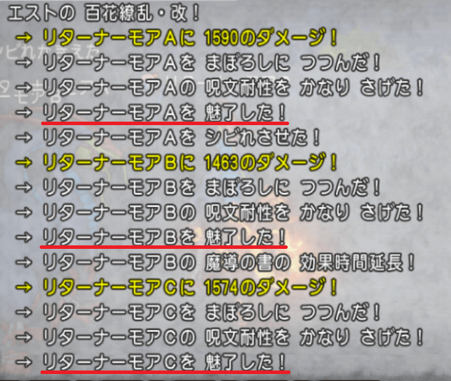 扇旅芸人は状態異常が入りやすいんで、とにかく追加効果の魅了が入る入る!ご存じの通り、魅了が入ると、効果が解除されるまでサポ仲間は一切攻撃しないんで、非常に戦闘のテンポが悪くなってしまいます。