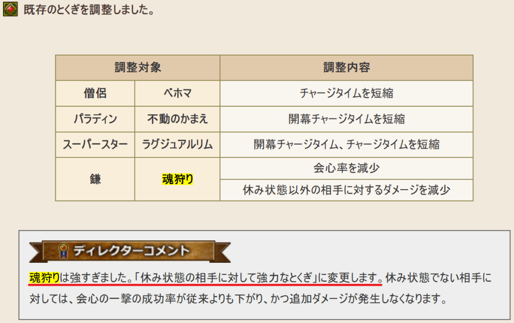 調べて見たらVer5.2のアプデで魂狩りに弱体化されたみたいっすね。この背景には、当時ガルドドンをスパ4構成で討伐するのが話題になりました。ボディーガードで安全を確保しつつ、魂狩りを連打して押し切る戦法で、想定外の攻略法と判断された可能性が高いっす。