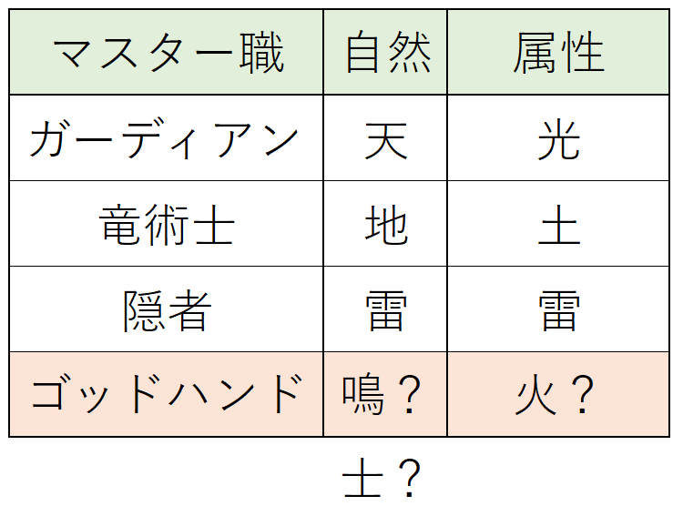 マスター職にはそれぞれ属性に特化した特技や呪文があります。次に来るゴッドハンドが扱う属性は「火」属性でしょうか?闘志・獅子・英雄というイメージから考えると、最有力は「火属性」。太陽や獅子の象徴とも一致します。
