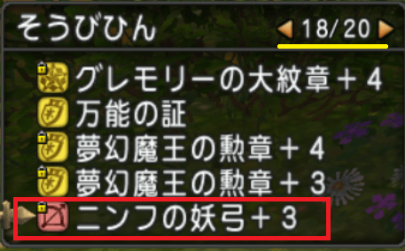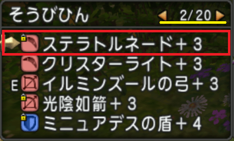 レンジャーは開幕にイルミンズールの弓を持ってCT短縮を狙う人が多いと思います。戦闘後すぐに武器を持ち替えることになりますが、特に何も調整をしていないと上の画像のように、爪は1ページ目、ブメは2ページ目、弓は18ページ目、斧は20ページ目と、もう装備を持ち替えるだけでてんやわんや💦してしまうことでしょう!これは新しく入手した装備は後ろのページに追加されるためです。しかも自分の場合ステラトルネードは「マヒ埋め」「呪速埋め」「マホ解除埋め」があるんで、ステラを選ぶだけでも大変です。