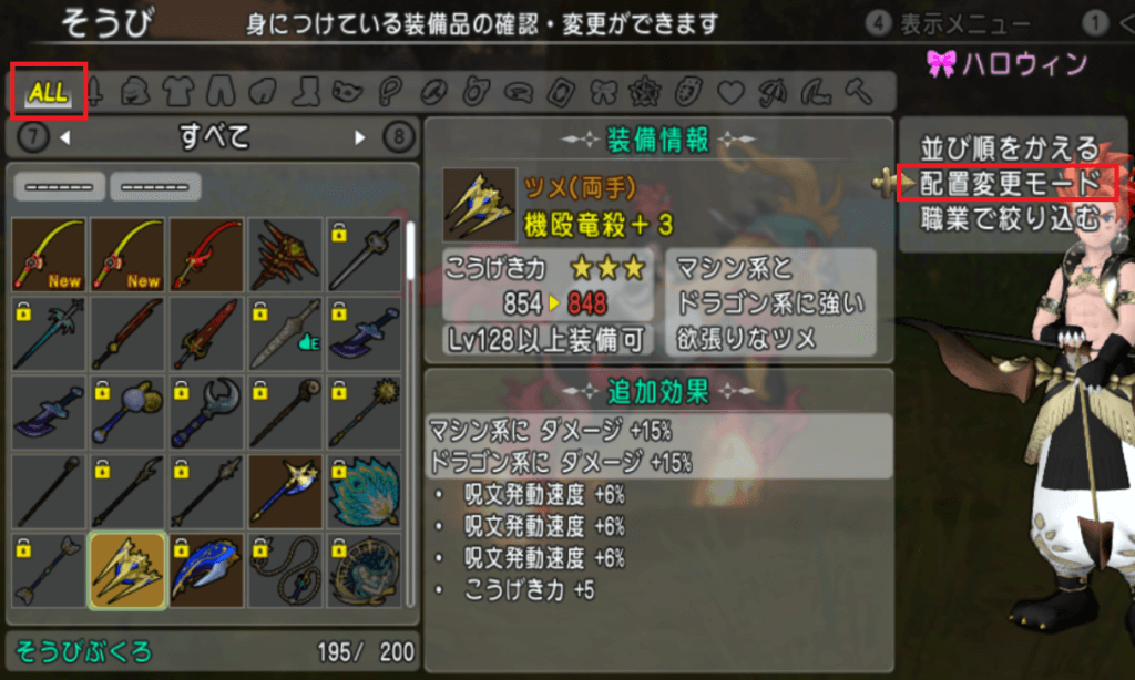 ここが重要です!「すべてのそうび」、アイコンでいうと「ALL」になっているのを確認して「配置変更モード」を選択します。※「剣アイコン」の装備画面で並び替えをしても反映されない点に注意!