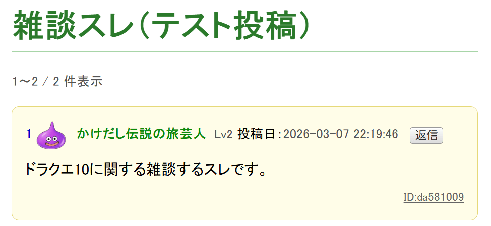 そんなこんな5ch停止に伴って、スレッドBBSを試作してみましたよ!特徴としては、名前が名無しの場合は、このブログのコメント欄と同様にランダムな職業が割振りされます。さらに、書き込みをするごとに経験値が得られLvが上がっていきます。レベルが上がると称号がかわったり、モンスターのアイコンが進化したりします。それ以外の構造は普通のスレッド掲示板とかわらないかなと思います。