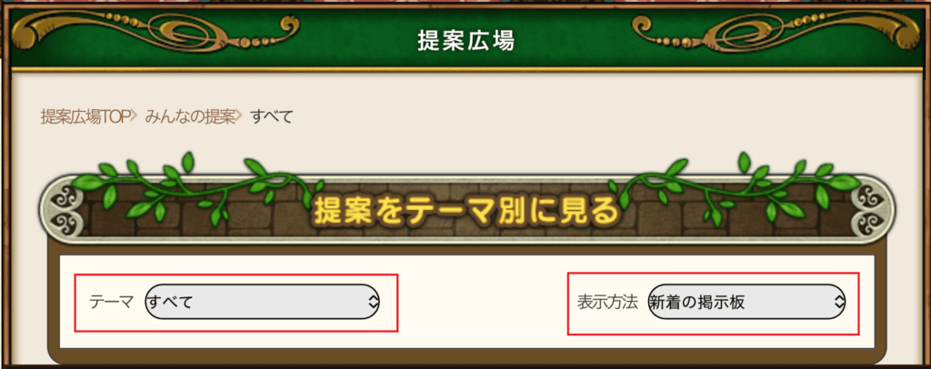 そして個人的に気になるのが、提案広場のプルダウンメニューです。テーマの「すべて」と表示方法の「新着の掲示板」の文字位置がズレていて、毎回ちょっと違和感があるんですよね。表示方法をセンタリングするか、先頭にスペースを入れて余白を持たせるなど、地味な部分ではありますが改善してほしいところです。