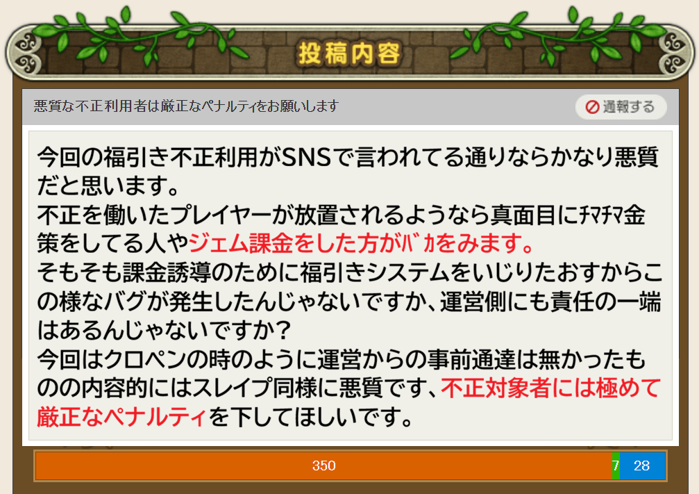 ご覧のように、SNSや提案広場でもこの件に関する投稿が相次いでいます。主な意見としては「不正利用した人に制裁を下してほしい」「謝罪や返金をしてほしい」「DQTVなどで経緯を説明してほしい」といったものが多く、類似の提案も含めて「そう思う」の声が多く集まっているのが現状です。