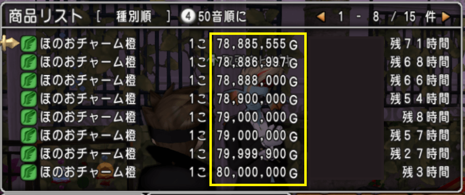ふくびきの仕様変更後、チャームの出品数は減少し、3月8日時点ではわずか74品となっています。価格もじわじわと上昇し、現在は7800万ゴールド付近まで高騰しています。