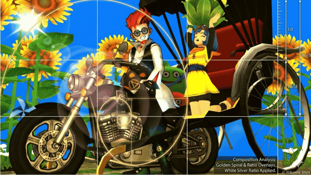 そして一番のこだわりは「黄金比」という考えっス。上の画像の線のように、カタツムリの殻のようにぐるっと広がっていく形が黄金比のイメージです。この流れに沿って配置することで、自然と視線が動き見ていて心地よい構図になります。