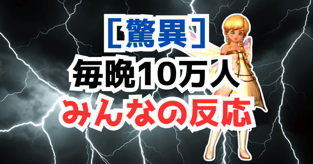 はーい!どーもどーもっス!本日は「DQ10は毎晩10万人が遊んでいる」という内容についてです。先日の春祭りイベントで堀井氏から発表がありましたが、改めて10万人ってとんでもない数字ですよね!実感が沸かない人も多いと思います。ネットでも話題になっていたので紹介して行きます!